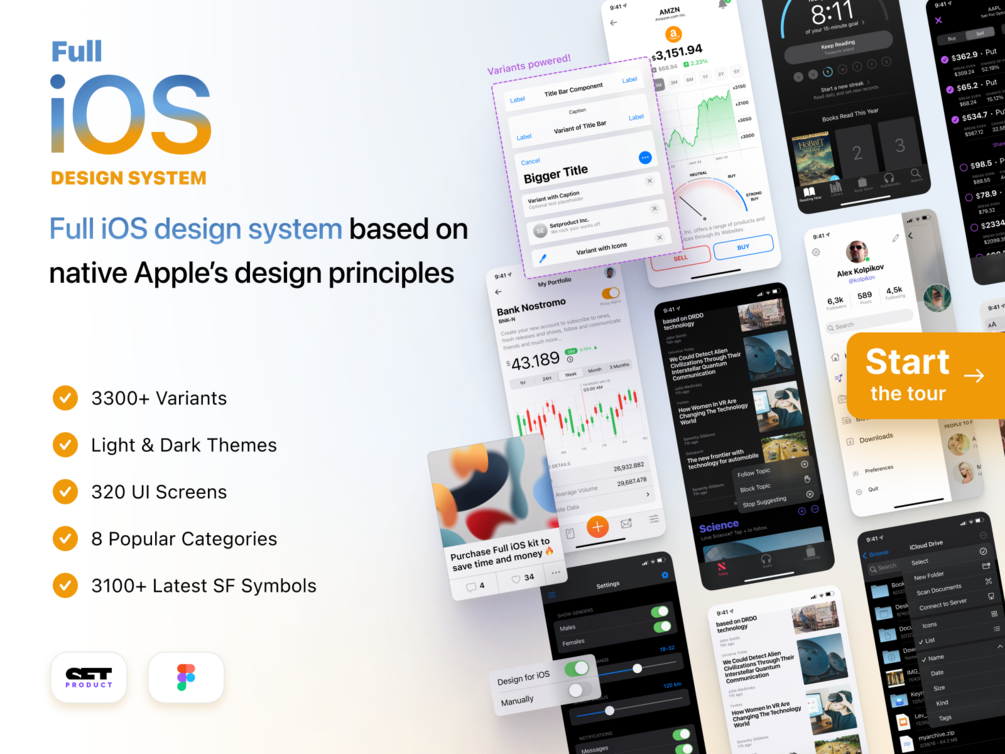 3300+ variants of 100+ components to craft perfectly shaped iOS apps. Powered by Figma auto-layout 3.0, Apple’s native styleguides and free Apple’s SF Pro font with original latest SF Symbols. Customizable & Adjustable mobile design system with 320 ready-to-use app layouts. You can modify them or use as it is to save time and never design from scratch again. Full iOS UI Kit is a well-organized library to help you learn Figma and take your UI design skill to the next level!